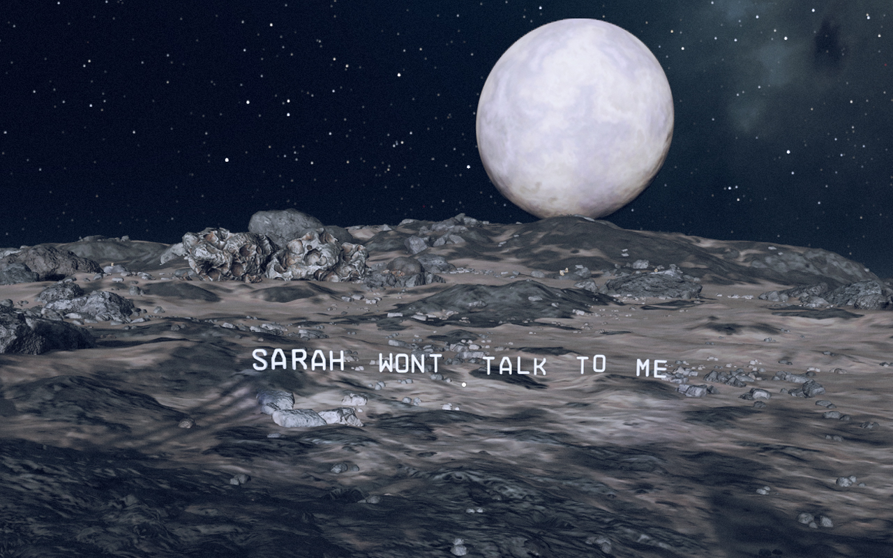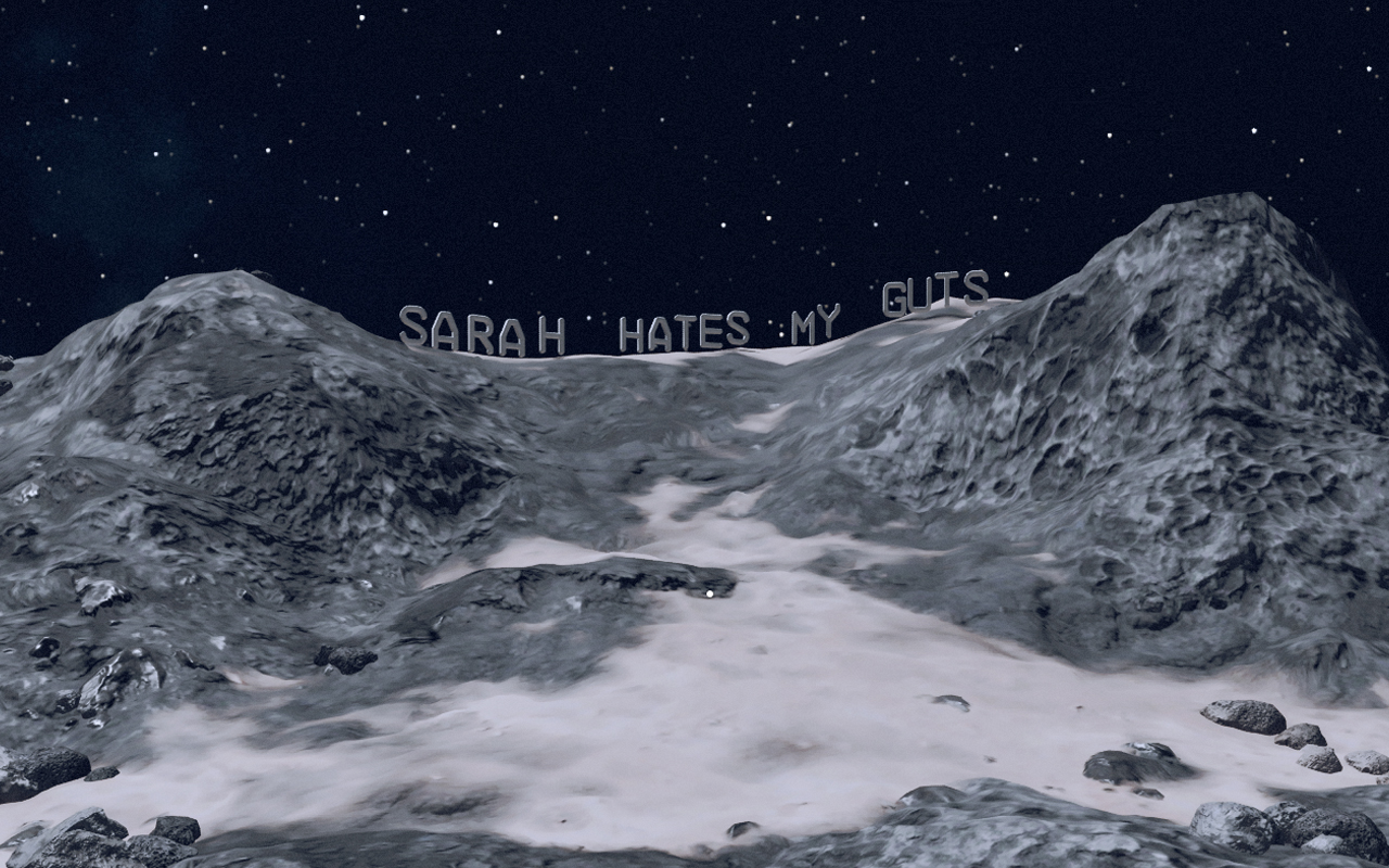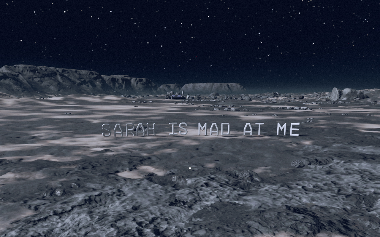 The Sarahs (2025) School of Art and Humanites at UC San Diego Night of Research and Creative Activities Showcase Does the algorithmically generated video game of Starfield (Bethesda Studios) simply reflect our society’s values as a mirror would? Or does it ask players to struggle with moral, if fictional, choices? While playing Starfield, I followed the narrative to a turning point in the game, when the player is asked to make a choice between two NPCs, one who will die and one who will live. I chose to save Sarah, and became obsesed with trying to keep her alive and happy with me as a companion. The text based messages in this project are created within the game, as assets within a colony-building mechanism. I think of them as public art constructions on fictional worlds. The slide show documenting the messages, reflecting my thoughts while playing the game, is intended to mimic the desktop photo album collectibles within the game world.